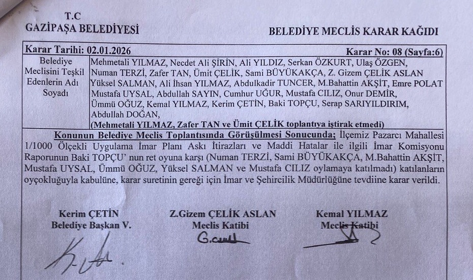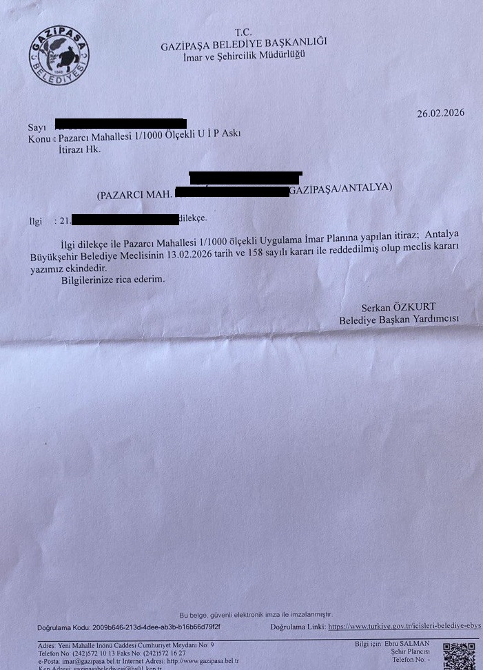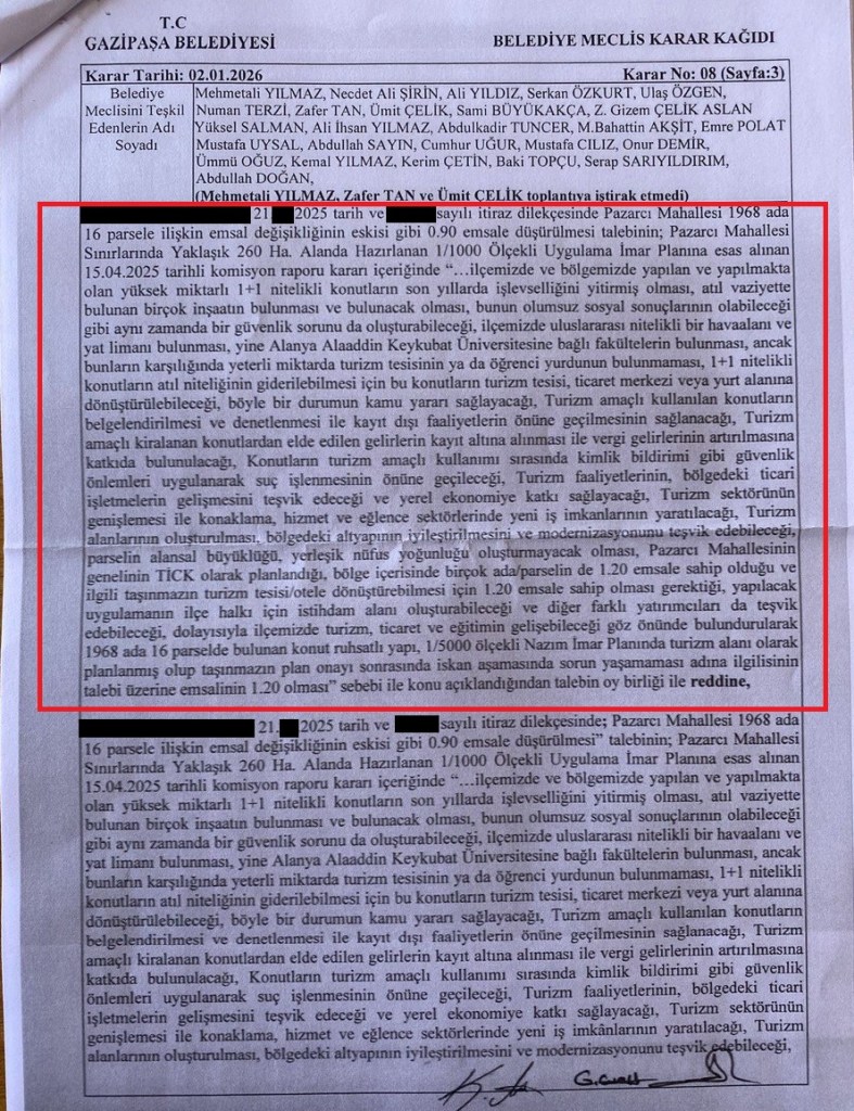 Gazipaşa Belediye Meclisi ise vatandaşların itirazlarını ilginç gerekçelerle reddederek planı onayladı. İlçe Belediyesinin ardından Antalya Büyükşehir Belediye Meclisi de 13 Şubat 2026 tarihli oturumunda planı onayladı. Gazipaşa Belediyesi’nin, kişiye özel imar rantı yaratacağı gerekçesi ile ilgili parsele yönelik emsal artışına yaptığı itirazları reddedilmesine, ilçedeki 1+1 konutların atıl kalmasını ve otel kullanımına dönüşmesiyle bu alanlarda güvenlik sorunlarının yaşanmasının önleneceğini gerekçe gösterdi. Belediyenin ret gerekçesinde ayrıca ilçede bir havaalanı ve yat limanı ile fakültelerin bulunduğu, konut kullanımının ticaret ya da turizm tesisine dönüştürülmesinin kamu yararı sağlayacağı öne sürülerek şöyle denildi: “…konutların turizm amaçlı kullanımı sırasında kimlik bildirimi gibi güvenlik önlemleri uygulanarak suç işlenmesinin önüne geçileceği, turizm faaliyetlerinin bölgedeki ticari işletmelerin gelişmesini teşvik edeceği ve yerel ekonomiye katkı sağlayacağı, ilgili taşınmazın turizm tesisi ve otele dönüştürülebilmesi için 1.20 emsale sahip olması gerektiği, yapılacak uygulamanın ilçe halkı için istihdam alanı oluşturabileceği ve diğer farklı yatırımcıları da teşvik edebileceği dolayısıyla 1968 ada 16 parselde bulunan ‘konut’ ruhsatlı yapı 1/5000 ölçekli nazım imar planında turizm alanı olarak planlanmış olup, taşınmazın plan onayı sonrasında iskân aşamasında sorun yaşamaması adına ‘ilgilisinin talebi üzerine’ emsalin 1.20 olması sebebiyle talebin oybirliğiyle reddine karar verildi.”