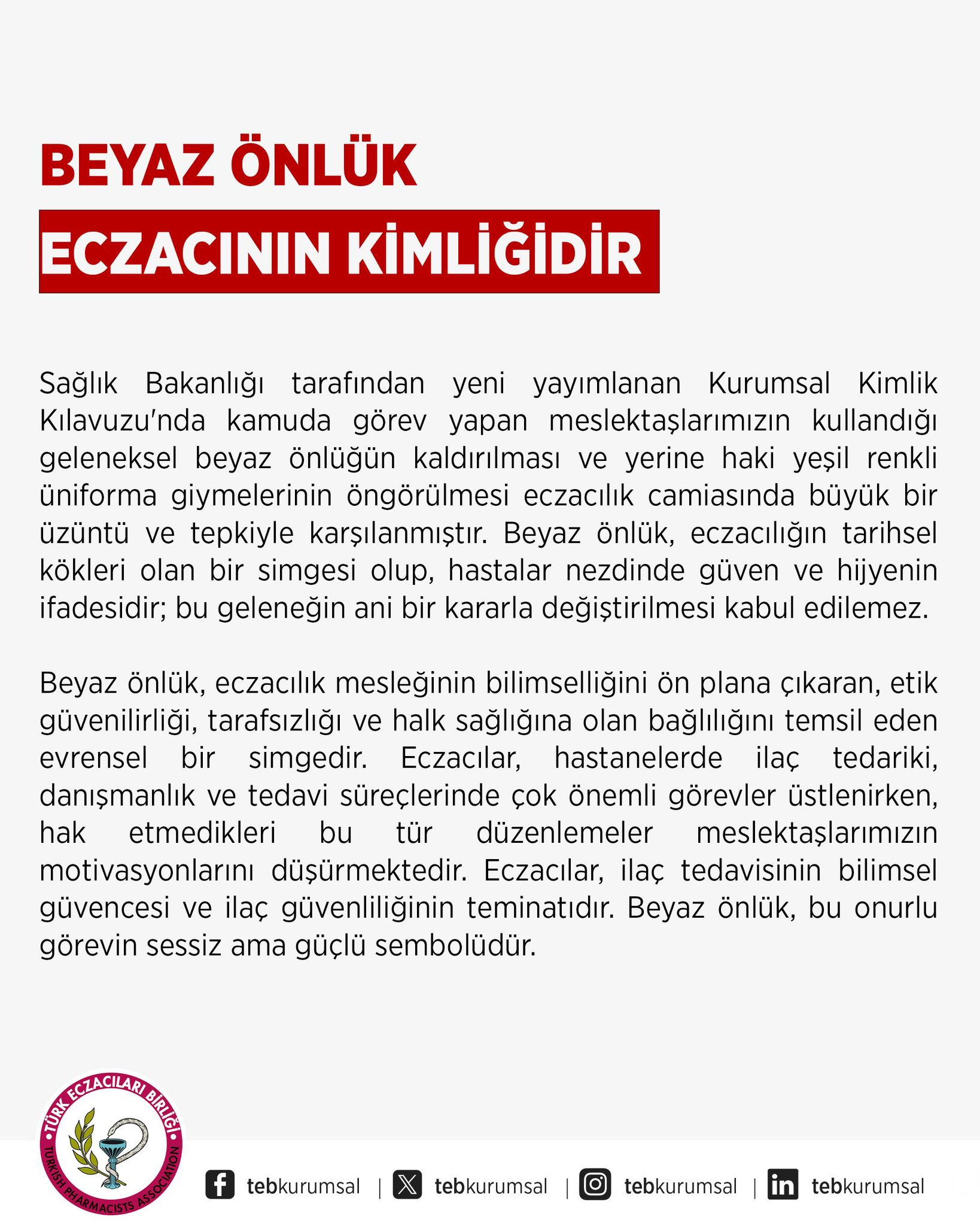 Türk Eczacıları Birliği açıklamasında, beyaz önlüğün eczacılığın tarihsel kökleri olan bir simge olduğunu ve hastalar nezdinde güven, hijyen ve bilimselliğin ifadesi olduğunu vurguladı. Açıklamada, "Beyaz önlük, eczacılık mesleğinin bilimselliğini ön plana çıkaran, etik güvenilirliği, tarafsızlığı ve halk sağlığına olan bağlılığını temsil eden evrensel bir simgedir. Bu geleneğin ani bir kararla değiştirilmesi kabul edilemez," ifadeleri kullanıldı.