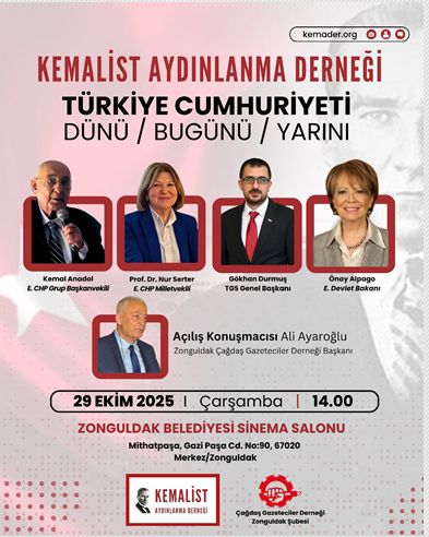 29 Ekim 2025 Çarşamba günü, saat 14.30'da Zonguldak Belediyesi Sineması’nda düzenlenecek olan panelde; Kemalist Aydınlanma Derneği Kurucu Başkanı ve Geçmiş Dönem CHP Grup Başkanvekili Kemal Anadol yönetici (moderatör) olarak yer alacak. Panelde konuşmacı olarak ise Geçmiş Dönem Devlet Bakanı Önay Alpago, Geçmiş Dönem CHP Milletvekili ve MYK Üyesi Prof. Dr. Nur Serter ve Türkiye Gazeteciler Sendikası Genel Başkanı Gökhan Durmuş bulunacak.