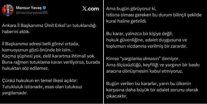 Ankara Büyükşehir Belediye Başkanı Mansur Yavaş, CHP Ankara İl Başkanı Ümit Erkol’un tutuklanması üzerine bir açıklama yaparak kararın "ölçüsüz ve keyfi" olduğunu savundu. Yavaş, yargının bir baskı aracına dönüştürülmesini kabul etmediklerini vurguladı.