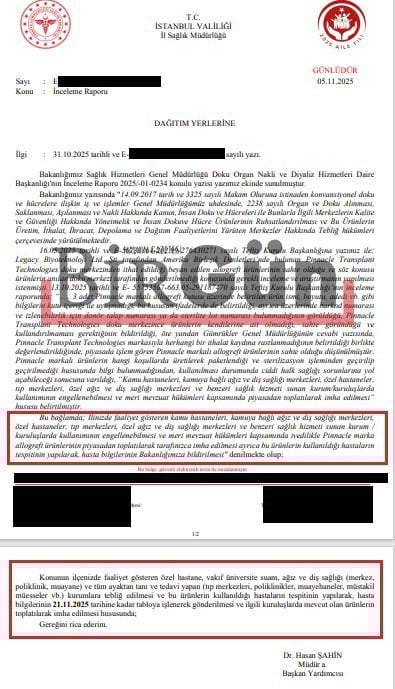 İl Sağlık Müdürlüğü’nün yazısında, “Pinnacle markalı ürünün kutusu üzerinde belirtilen ürün ismi, boyutu, adedi vb. gibi bilgilerin kutu içeriği ile uyuşmadığı, ayrıca üzerlerinde barkod numarası ve izlenebilirlik için donör takip numarası ya da sterilite lot numarası bulunmadığının görüldüğü, ABD’deki doku merkezince ürünlerin kendilerine ait olmadığı, sahte göründüğü ve kullandırılmaması gerektiğinin bildirildiği” vurgulandı.