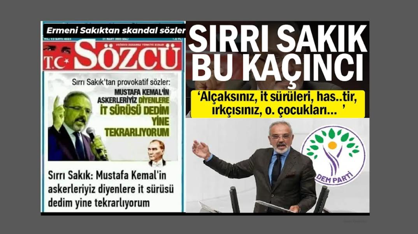 Ergenekon-Balyoz kumpaslarının gizli tanığı ‘parmaksız Zeki’ kod adlı terörist Şemdin Sakık’ın kardeşi ve 1977 yılında 16 yaşındaki bir kıza silah zoruyla tecavüz etmekten Muş Ağır Ceza Mahkemesi tarafından 9 ay hapis cezası alan Sırrı Sakık’ın, alçaklığın tarifi için aynaya bakması gerekir. Atatürk ve silah arkadaşlarına yönelik skandal ifadeler kullanan Sırrı Sakık için CHP yönetiminden yine ses çıkmadı. Daha önce de Mustafa Kemalin askerleriyiz diyenler için ‘itler sürüsü’ diyen Sırrı Sakık, şimdi işi alçaklığa kadar getirdi. Bu söylemlere ses çıkarmamak, bunları onaylamak anlamına gelmektedir. CHP yönetimi cumhuriyetimize yapılan saldırılara sessiz kalınca iş Atatürk’ü aşağılamaya kadar geldi. Etnikçilikten oy beklentisine son verilmezse daha başka söylem ve eylemler de sıradadır.